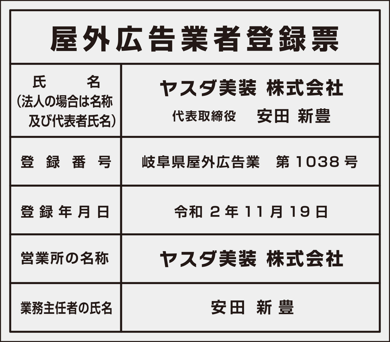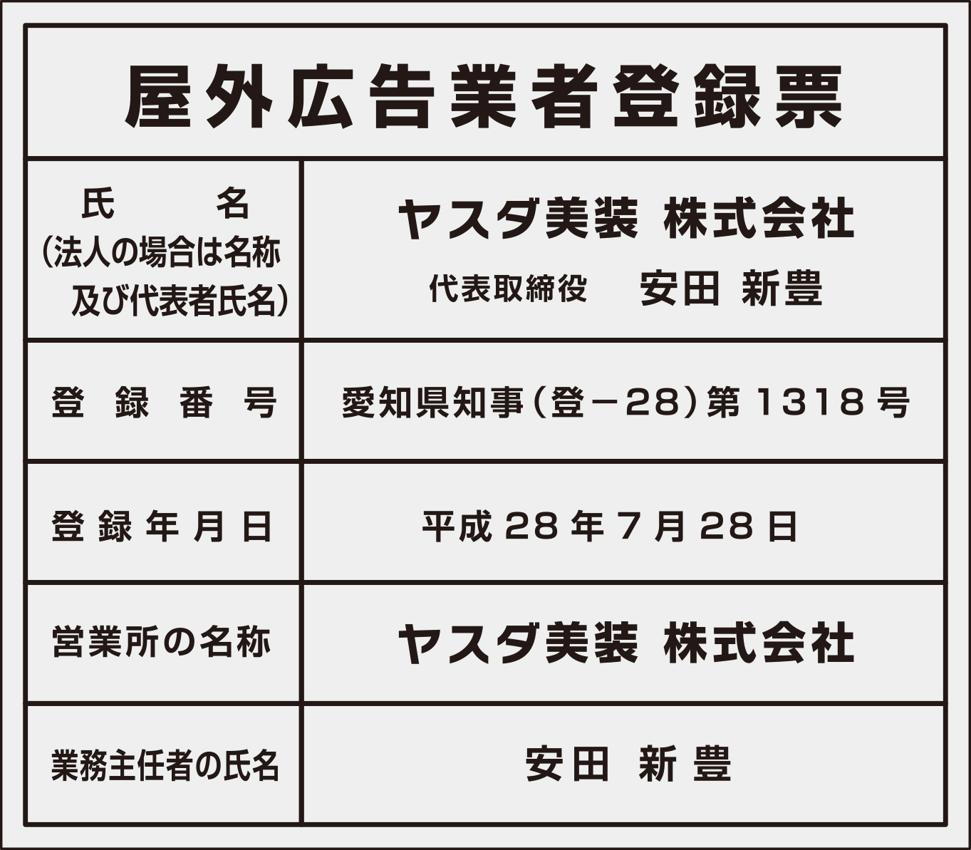 ● 屋外広告業者登録票を変更しました。
