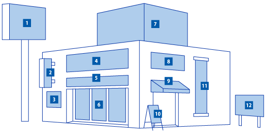 ⑦屋上看板 ⑧LED看板 ⑨テント看板 ⑩スタンド看板 ⑪懸垂幕 ⑫立看板